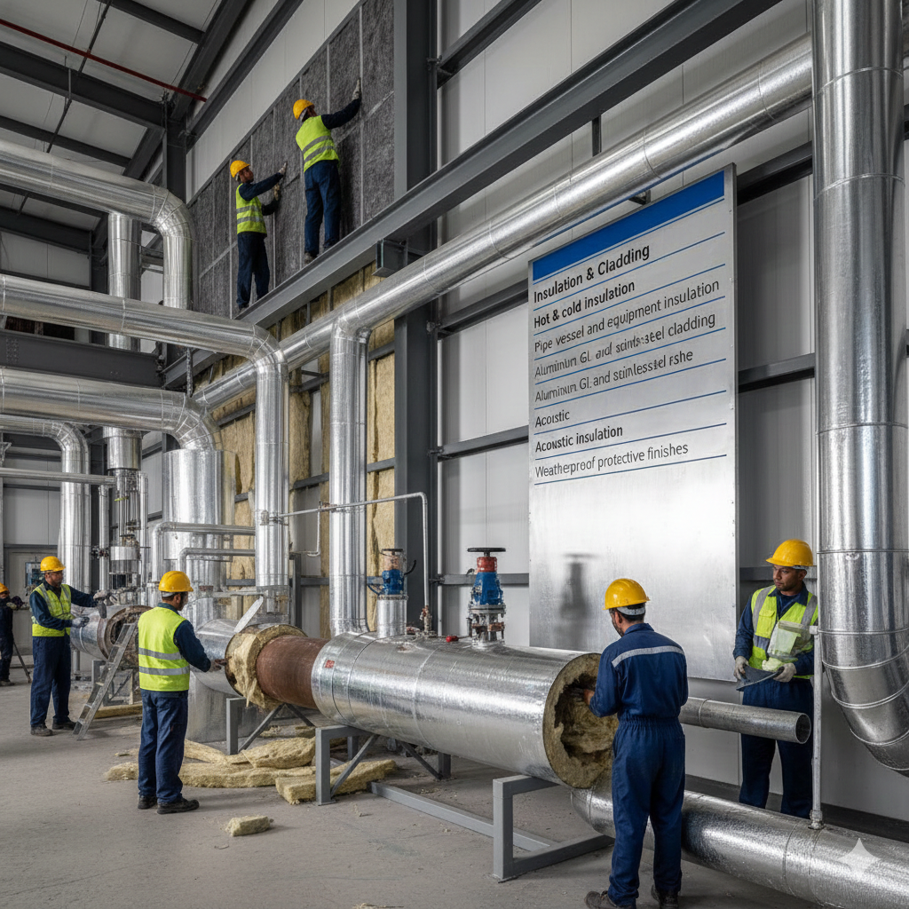 Proper insulation protects systems from heat loss, condensation, corrosion, and mechanical damage. Our cladding solutions enhance durability while maintaining neat industrial aesthetics.
